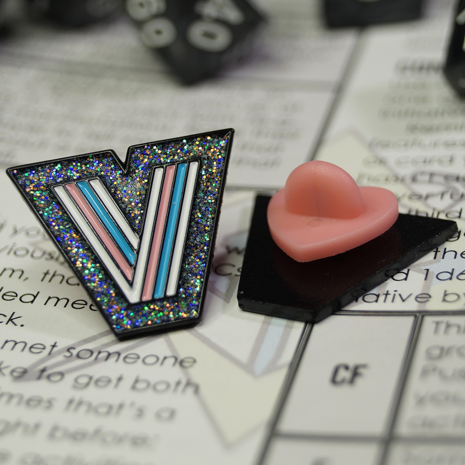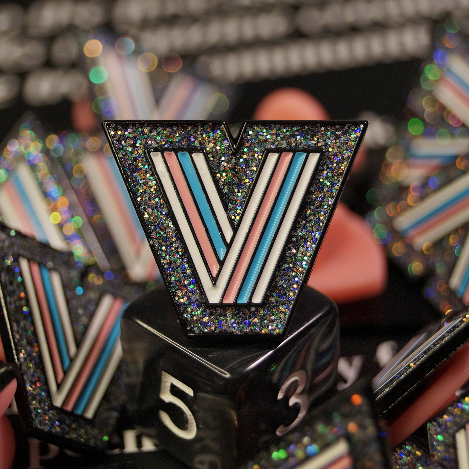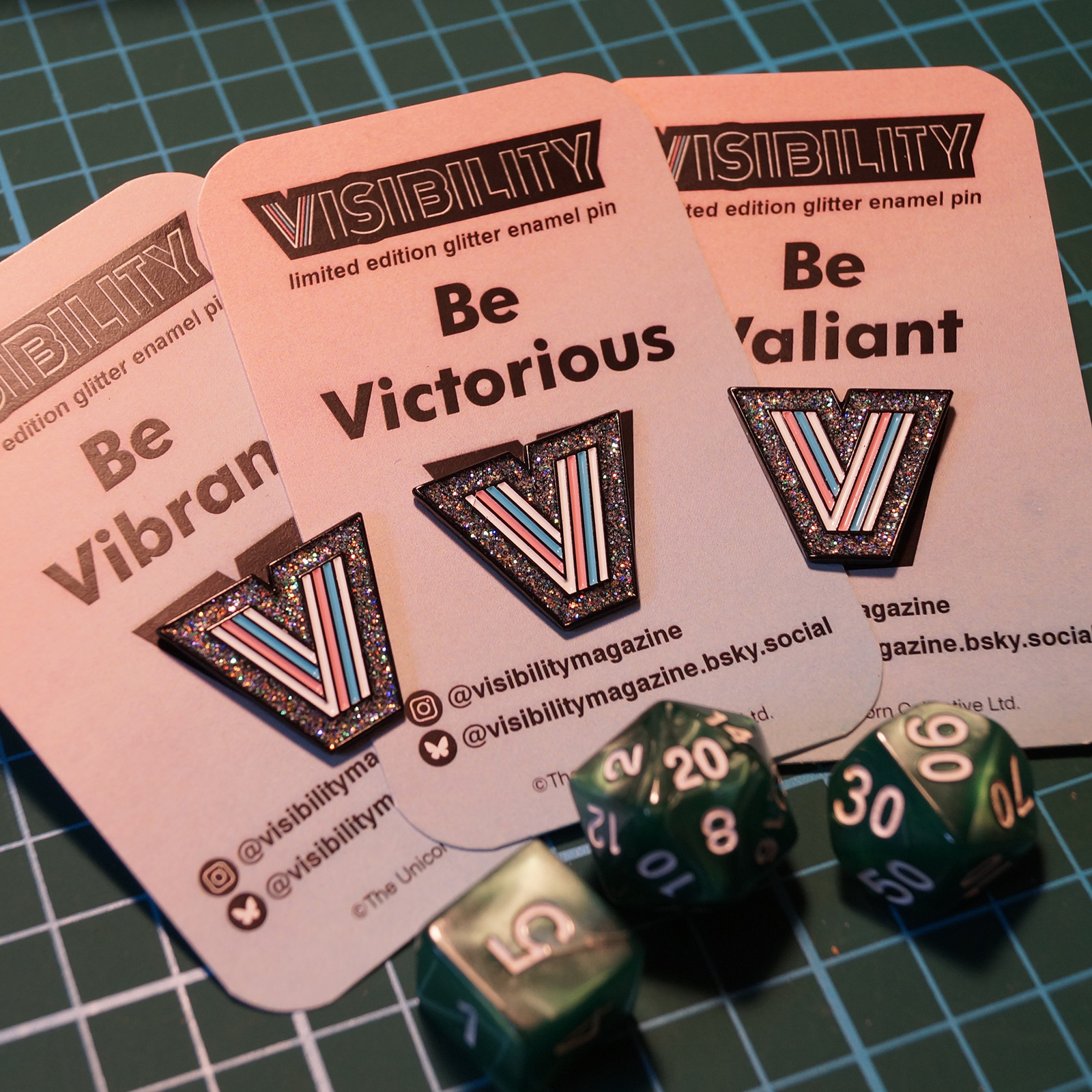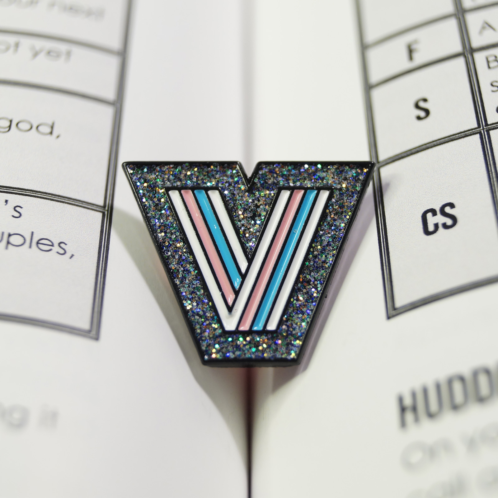 Our badge is 25mm of dyed black metal, with the classic Visibility ‘V’ in soft enamel and a glitter resin surround. Feel proud wearing this vibrant display of trans power!
